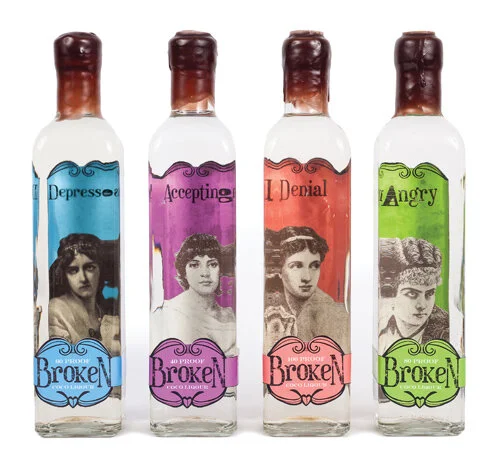 Break-ups suck, these liquor kits were created based on the four dominant stages of a break-up: denial, anger, depression, and acceptance. Each stage of a breakup is paired with a specific alcohol percentage that best represents the emotionial state of the drinker (i.e. higher proof for a more dramatic stage).